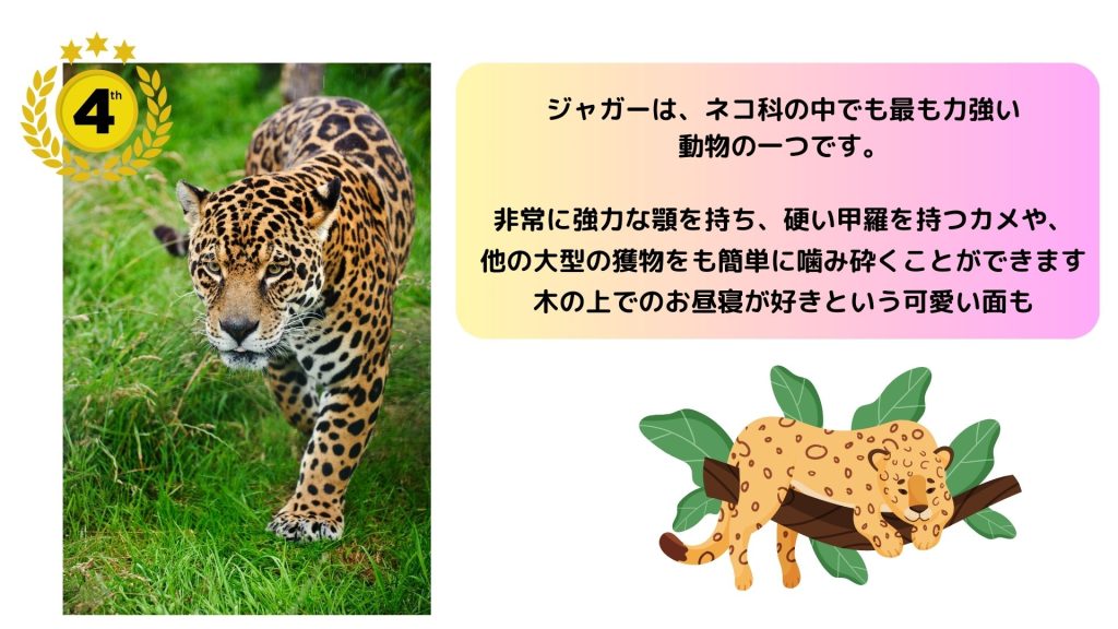ジャガーは、ネコ科の中でも最も力強い動物の一つです。